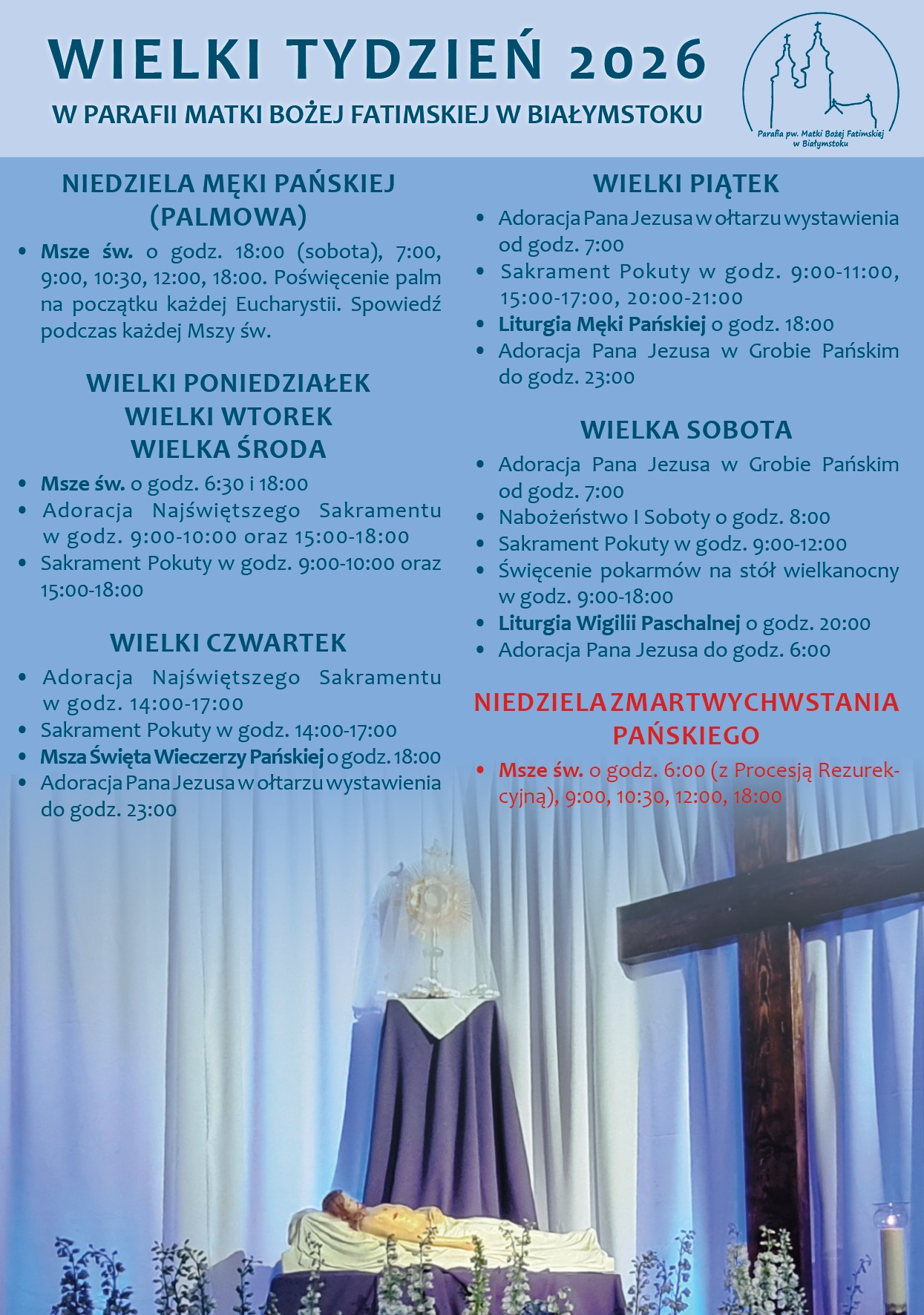 Wielki Tydzień 2026 23 marca 2026 | autor: Ks. Proboszcz Zapraszamy do udziału w nabożeństwach Wielkiego Tygodnia i Triduum Paschalnego w naszej parafii