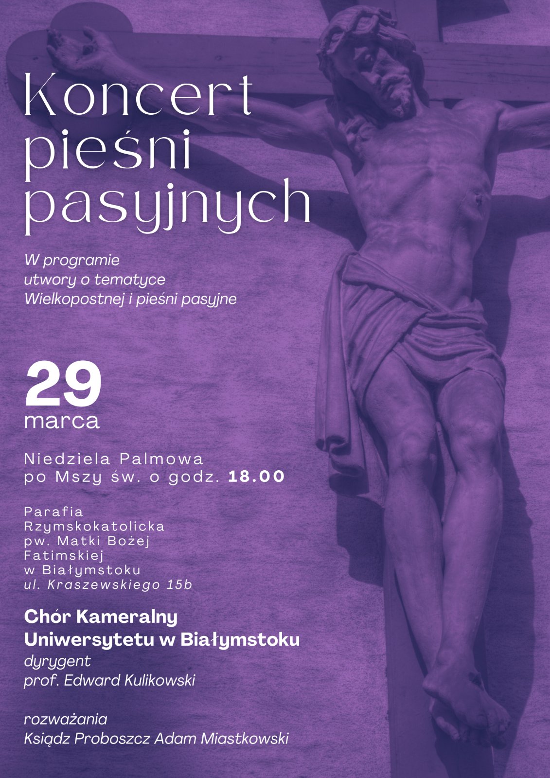 Koncert pieśni pasyjnych w wykonaniu Chóru Kameralnego Uniwersytetu w Białymstoku pod kierunkiem prof. Edwarda Kulikowskiego odbędzie się w niedzielę 29 marca 2026 r. po Mszy św. o godz. 18.00 w naszym kościele. Serdecznie zapraszamy na to wydarzenie.